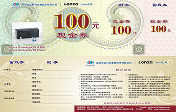 從2011年3月1日起,達(dá)科為公司Amaxa轉(zhuǎn)染試劑盒推出送禮活動,凡購買25Test轉(zhuǎn)染試劑盒均贈送一張100元現(xiàn)金券(以此類推,多買多送), 具體使用方法見上圖現(xiàn)金券,咨詢熱線:800 830 4366 電話:0755-26410427 26650164